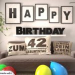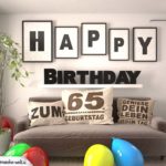 Eingerichtetes Wohnzimmer mit Couch auf der ein Kissen mit einem Spruch liegt. Überall liegen bunte Luftballons. An der Wand steht Happy Birthday
