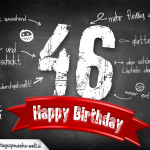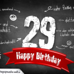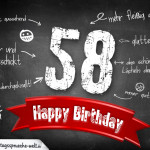 Geburtstagskarte mit vielen Komplimenten auf Tafel geschrieben und rotem Banner „Happy Birthday“.
